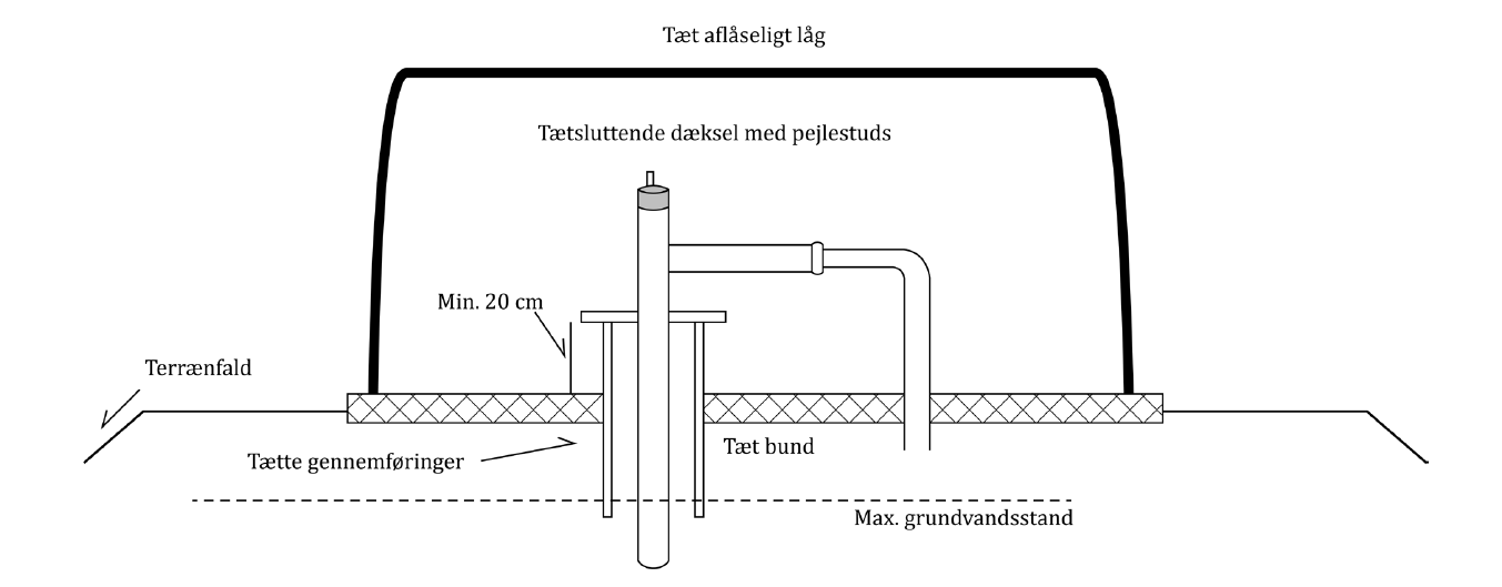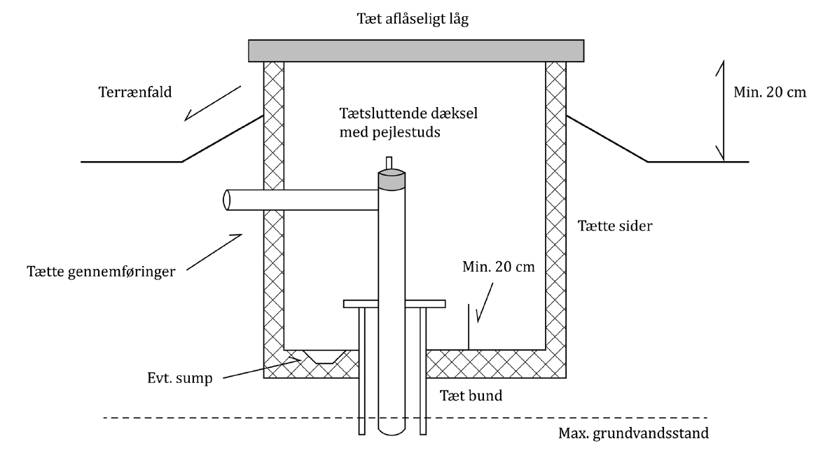 - den skal være udført med tætte sider og tæt bund, eventuelt med fald mod sump