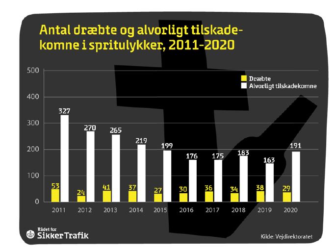 For alkohol er involveret i knap hver femte dødsulykke i trafikken, og ikke færre end 167 personer mistede livet i trafikulykker, hvor alkohol var involveret i årene 2016-2020.